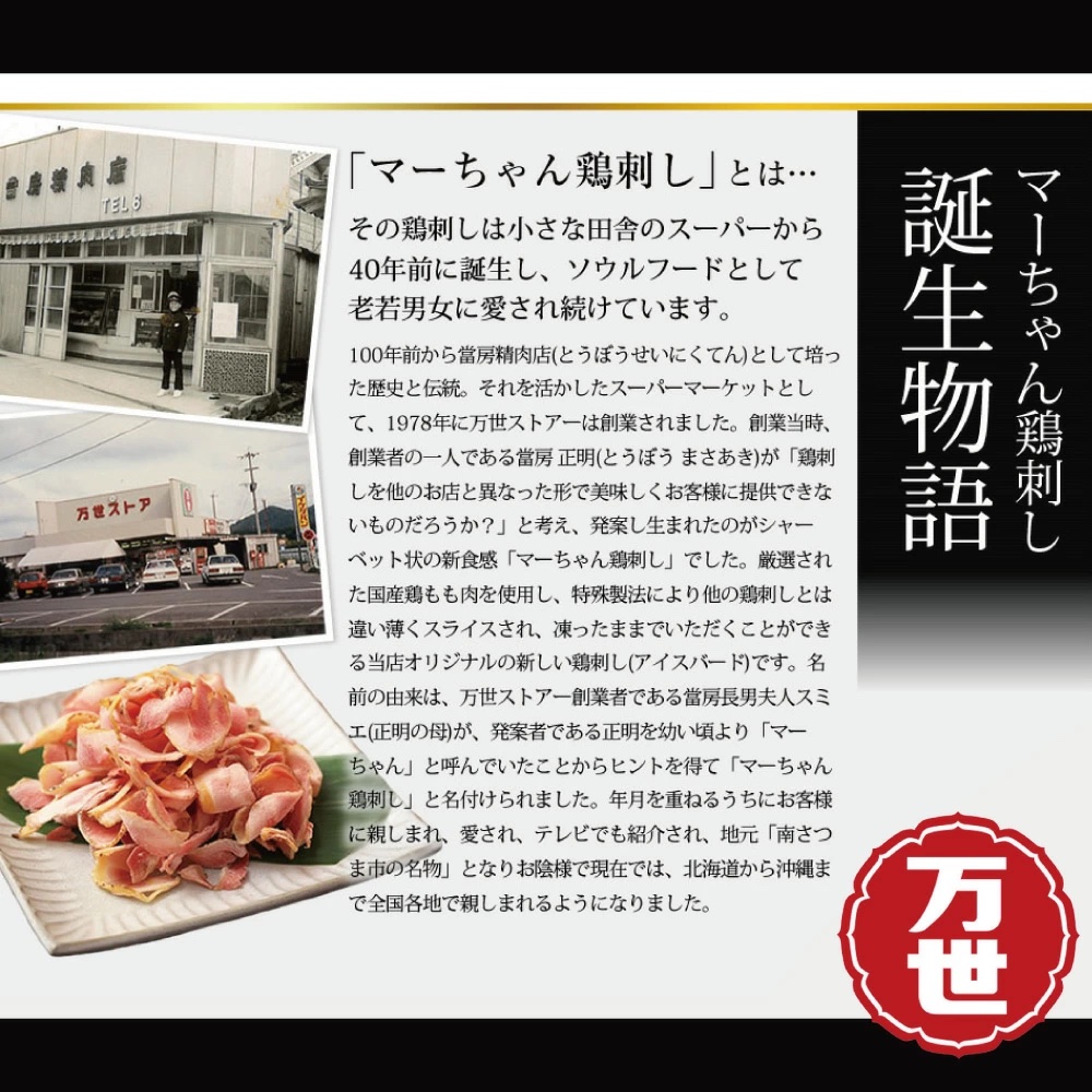 【万世ストア】マーちゃん鶏刺し(アイスバード) 私たちの市からお届けできるものを作りたい。そんなコンセプトで南さつま市観光協会が選んだ特産品のギフトです。スタッフ一押の南さつまの逸品で、御礼のギフトにも喜ばれます。********************************* こちらの商品は送料込み商品です!!!※ただし、北海道・沖縄へのお届けは別途送料+1,100円をいただきます。********************************* 販売価格 3,500円(税込み) 会員価格 (税込み) 通常価格 (税込み) 在庫 商品コード torisashi JANコード 1セット 2セット 3セット 4セット 数量 - + カートに入れる カテゴリー 肉類 キャンペーン すべての商品| 冬の贈り物《ギフト対応》| 夏の贈り物《ギフト対応》 個別送料 0円 RECOMMENDEDおすすめアイテム 【コワダヤ】鹿児島県産黒豚バラエティセットKPWN 5,450円(税込み) 【山野井】炭火釜焼き焼豚とハムセット 4,980円(税込み) 【コワダヤ】鹿児島産黒豚焼豚・ローストポーク3本セット 5,000円(税込み) 【小田畜産】小田牛レトルト4種 5,700円(税込み) 【小田畜産】小田牛カタロースすきしゃぶ用300g 5,700円(税込み) 【小田畜産】小田牛点心&ステーキセット 6,200円(税込み) 【山野井】炭火釜焼き焼豚とスライスセット 4,440円(税込み) 【山野井】炭火釜焼き焼豚と合鴨セット 6,600円(税込み) 【二見屋】皮から手作り黒豚ギョウザ 4,200円(税込み) 【コワダヤ】鹿児島県産黒毛和牛・黒豚食べ比べ 7,400円(税込み) 【二見屋】黒豚の詰め合せセット(2種) 4,900円(税込み) CAMPAIGNキャンペーン すべての商品 冬の贈り物《ギフト対応》 夏の贈り物《ギフト対応》 CATEGORYカテゴリー 詰合せセット 魚介類 肉類 お茶 柑橘加工品 調味料 スイーツ・フルーツ 本格焼酎 工芸品・装飾品・本 健康食品 2026年02月 日 月 火 水 木 金 土 1 2 3 4 5 6 7 8 9 10 11 12 13 14 15 16 17 18 19 20 21 22 23 24 25 26 27 28 2026年03月 日 月 火 水 木 金 土 1 2 3 4 5 6 7 8 9 10 11 12 13 14 15 16 17 18 19 20 21 22 23 24 25 26 27 28 29 30 31 定休日 発送休業日